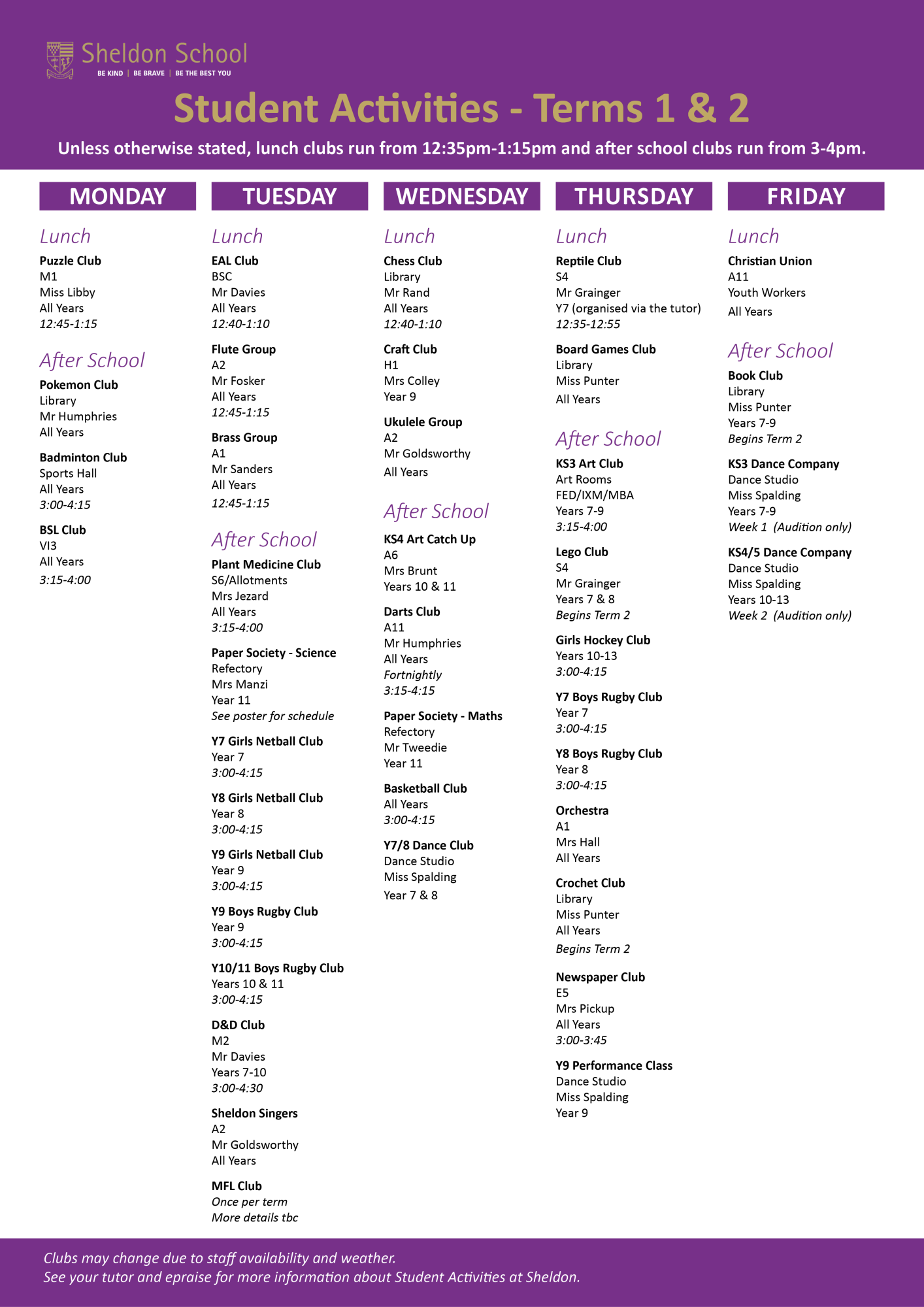 BSL Club | Y8 Girls Netball | Y11 Paper Society - Maths | Y10-13 Girls Hockey Club | KS4/5 Dancy Company (WK1) |
