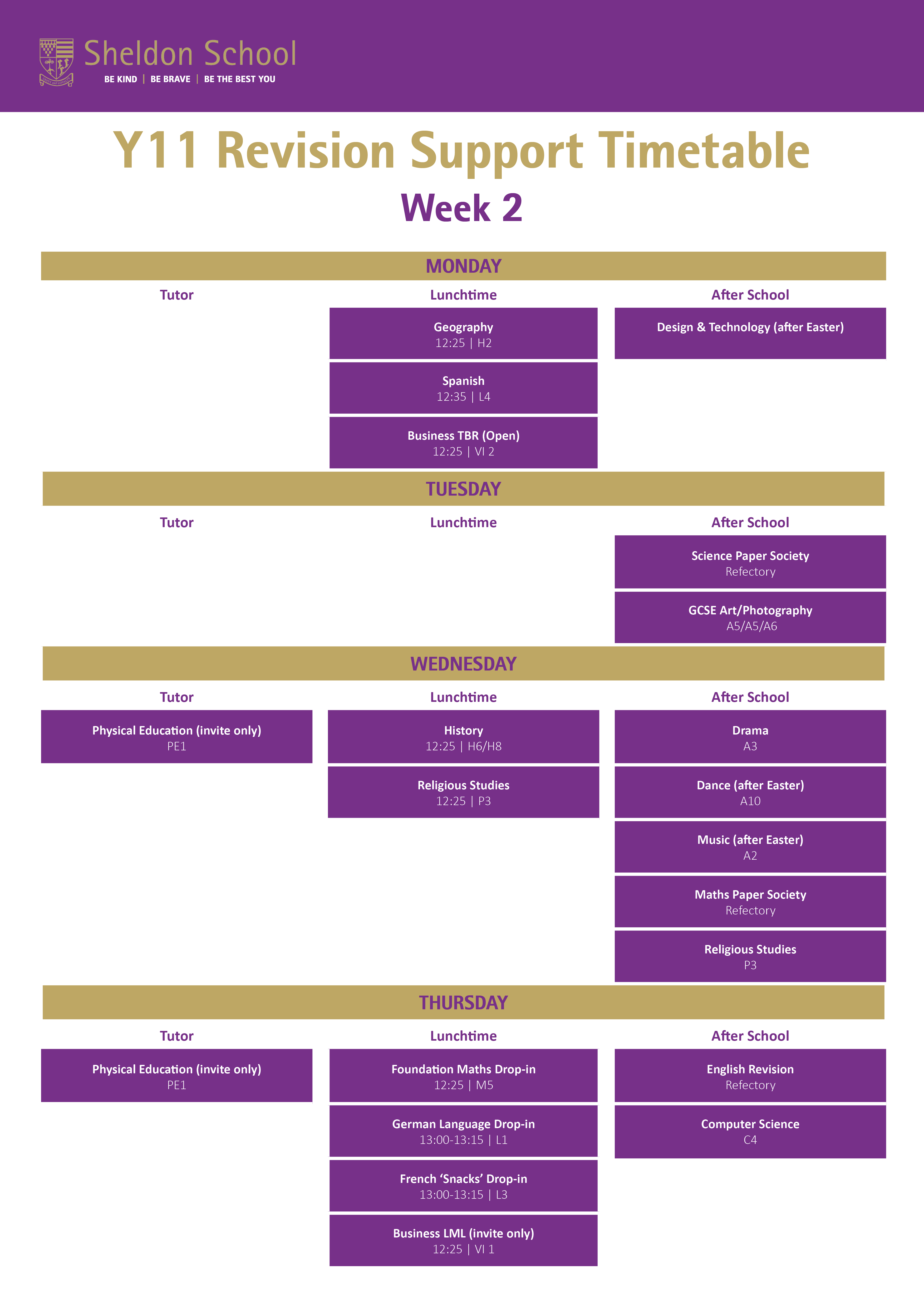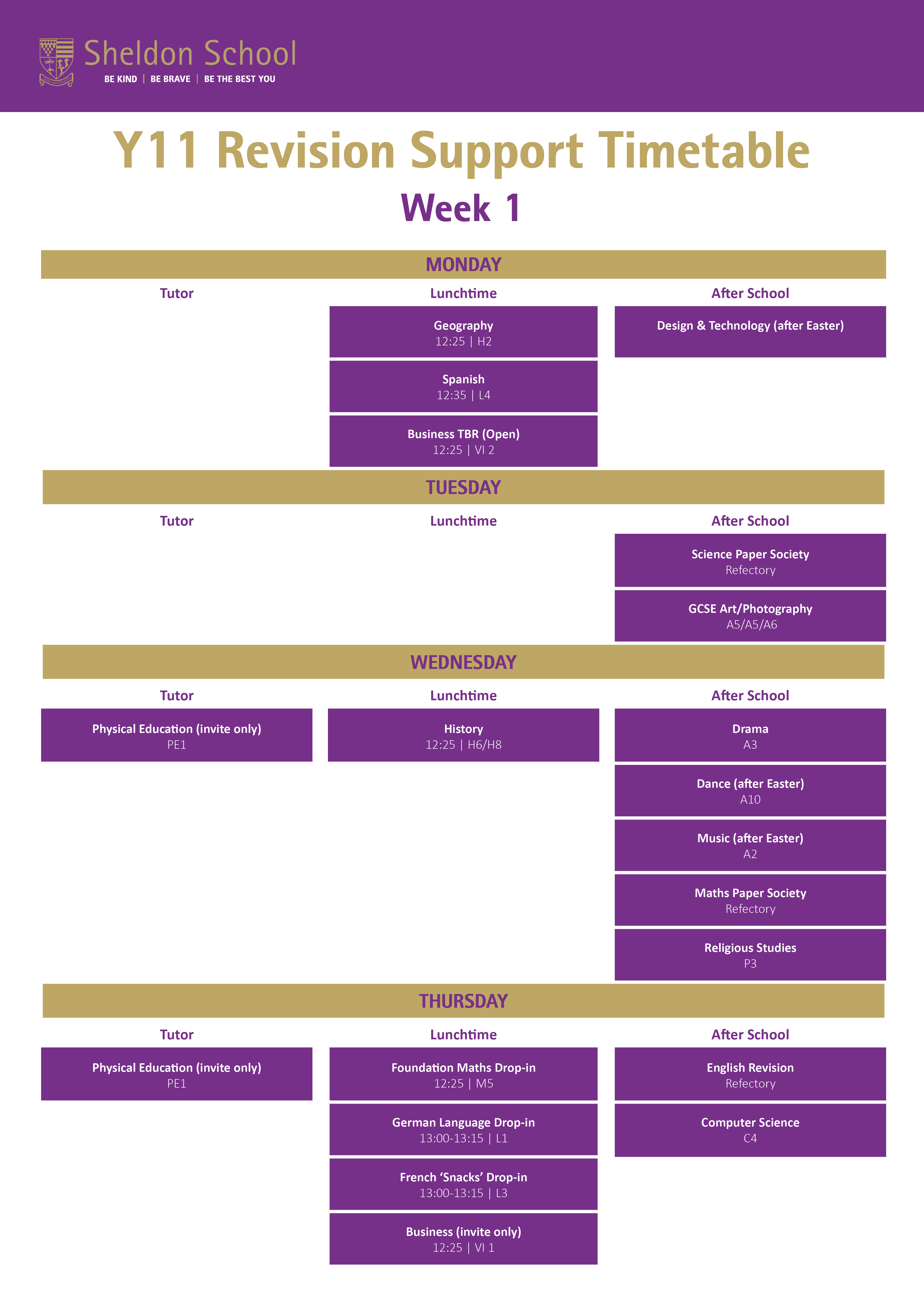 Year 11 revision workshops are designed to support students in the lead‑up to their examinations. These sessions are designed to give students focused support in key subjects. We strongly encourage all students to attend the sessions relevant to them, as this additional input can make a significant difference to their confidence and progress.